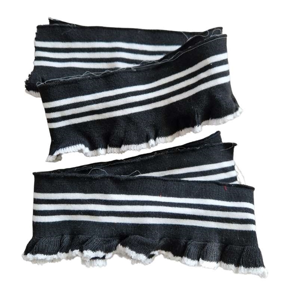 Du får 2 stk. ribkant med striber, der måler cirka 8 cm i bredden og selve ribstykket er 80 cm langt. Ribkanten er vævet i bomuld med sort som grund farve og hvide striber.