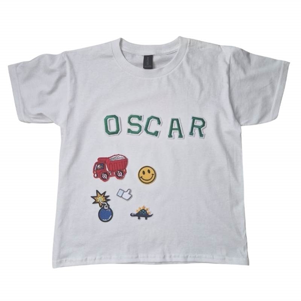 Her får du en grå bomulds t-shirt, fem assorterede strygemærker samt op til 8 bogstaver i farven , grøn, guld, sort, pink eller blå.