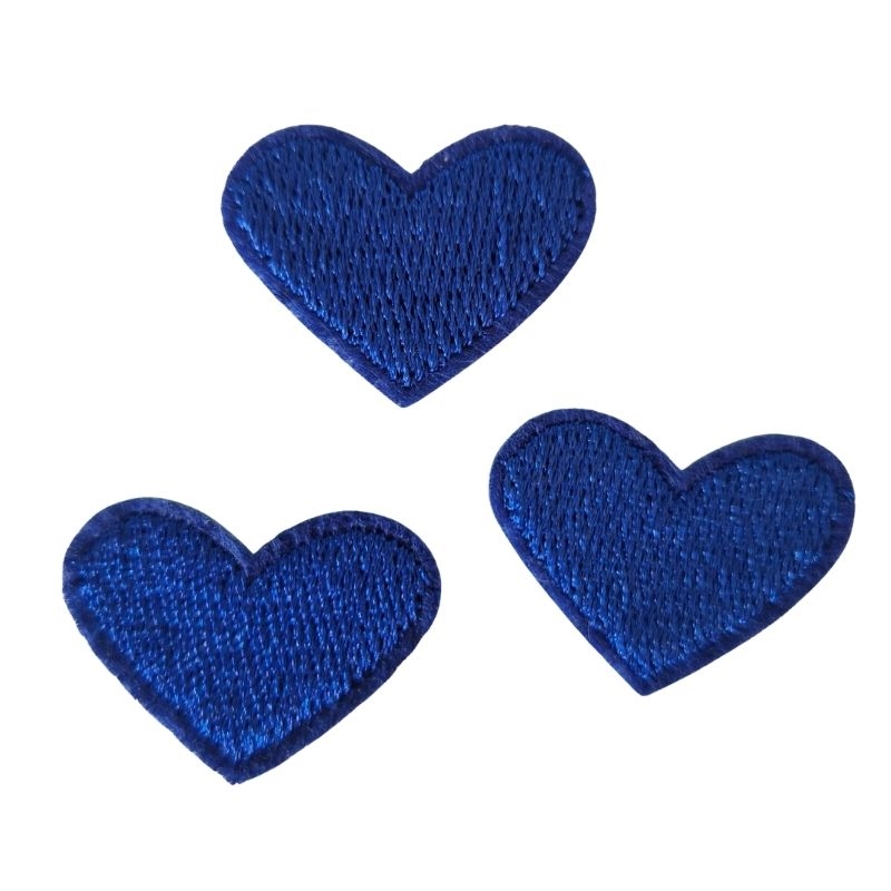 Sæt bestående af 3 stk. hjerter broderet med blå  tråd. hjerterne måler cirka 2,5x2 cm. og er lige til at stryge på tøjet.