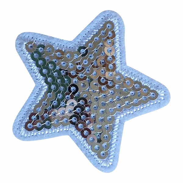 Strygemærke stjerne med sølv palietter på hvis baggrund 4,5x4,5 cm. Stjernen er lige til at stryge på stoffet.