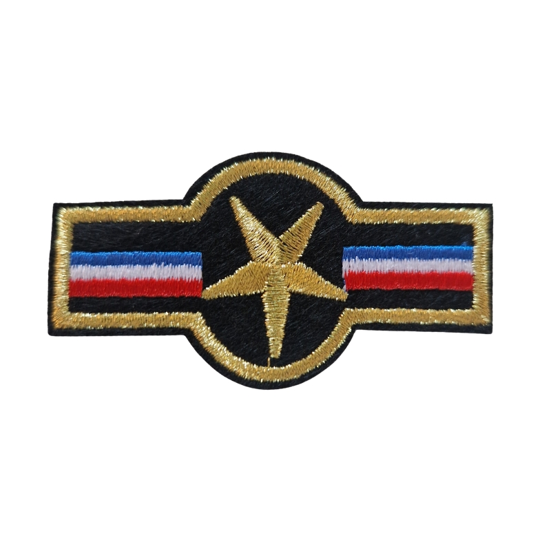 Strygemærke army tegn i sort, hvid, blå, rød og guld. Strygemærket måler cirka 6,5x3,5 cm