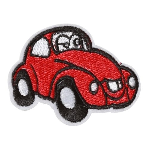 Strygemækre bil, strygemærket er brodere på hvidt filt broderingerne er røde og sorte. Bilen er en bobbel der har øjne. Strygemærket måler cirka 7,5x5,5 cm og er lige til at stryge på tøjet.