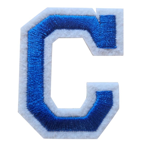 Strygemærke C er broderet på hvidt filt med sort tråd. Mærket måler 5 cm i højden og 3,8 cm i bredden.