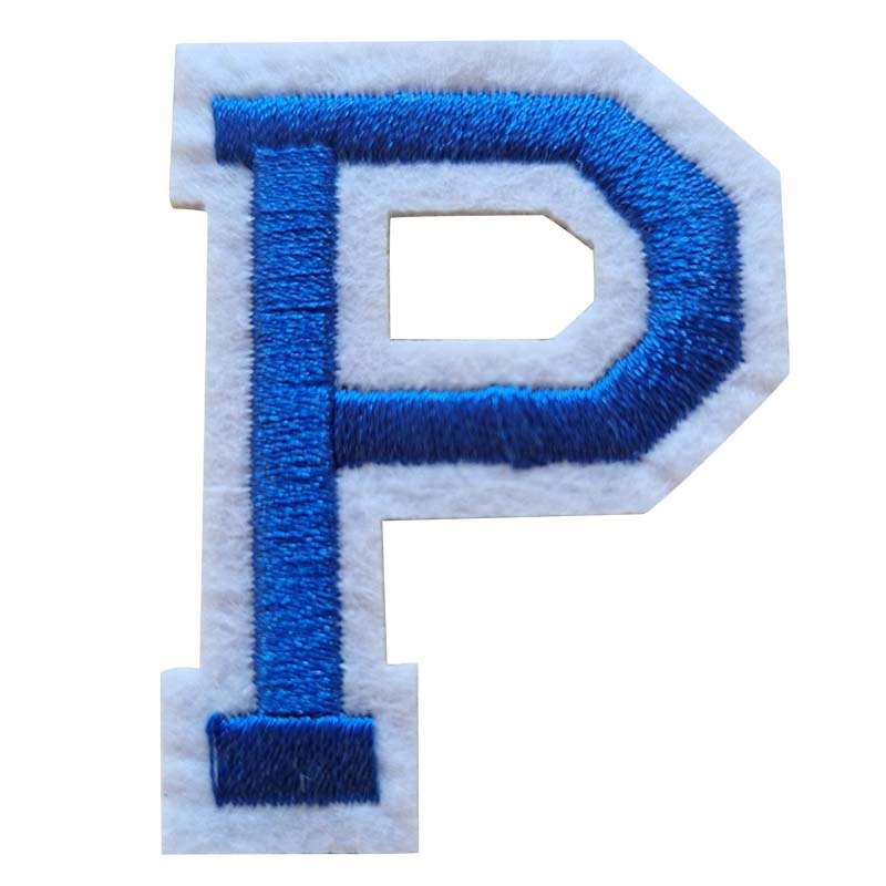 Strygemærke P er broderet på hvidt filt med blå tråd. Mærket måler 5 cm i højden og 3,8 cm i bredden.