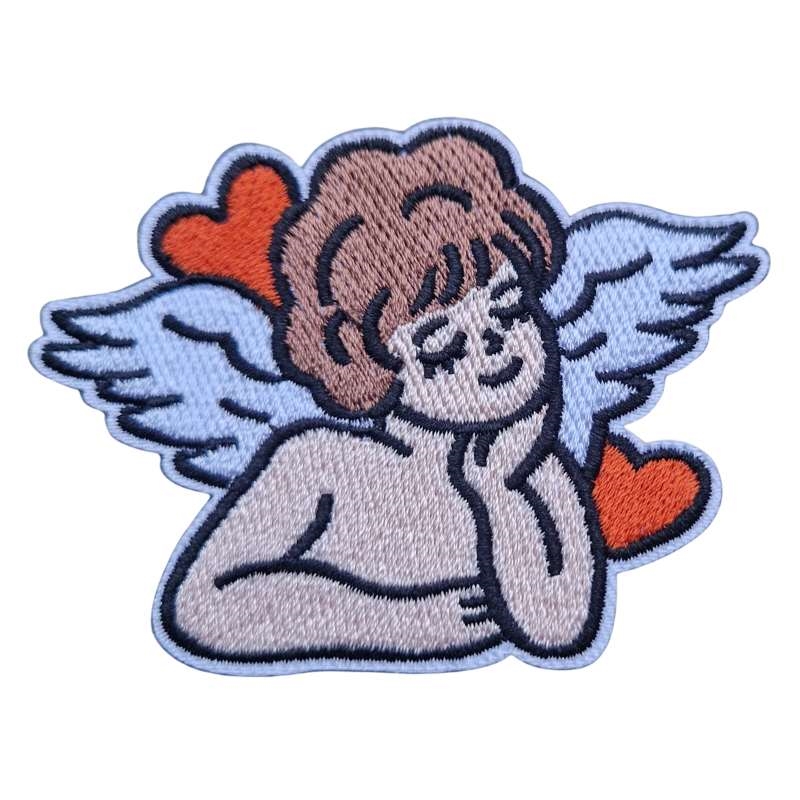 Strygemærke engel med hjerter, strygemærket måle cirka 8x6 cm. Strygemærket er i farverne hvid, hudfarvet, brun og røde hjerter. Lige til at stryge på tøjet