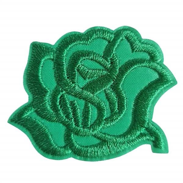 Strygemærke af rose der måler cirka  4,5x3,5. Rosen er helt grøn, broderet med grøn tråd på grønt satin. Et meg fint tynd strygemærke, der giver et eksklusivt look.