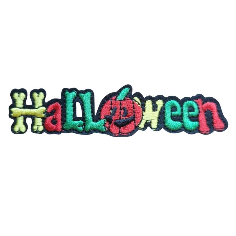 Strygemærke med teksten HALLOWEEN i farverne gul, rød og grøn. Halloween strygemærket måler cirka 10x2 cm og er hurtig og nemt strøget på tøjet. Se eventuel vejledning for påsætning af strygemærke her