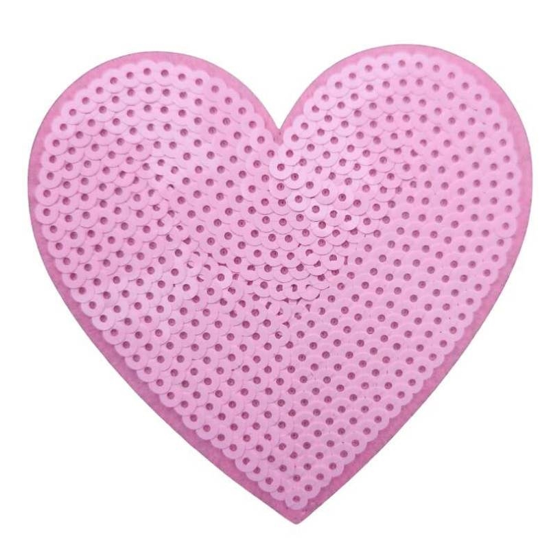Strygemærke formet som hjerte med lyserøde pallietter. Strygemærket måler cirka 10x10 cm.