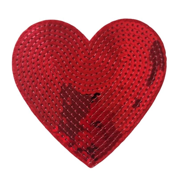 Strygemærke formet som hjerte med røde pallietter. Strygemærket måler cirka 10x10 cm.