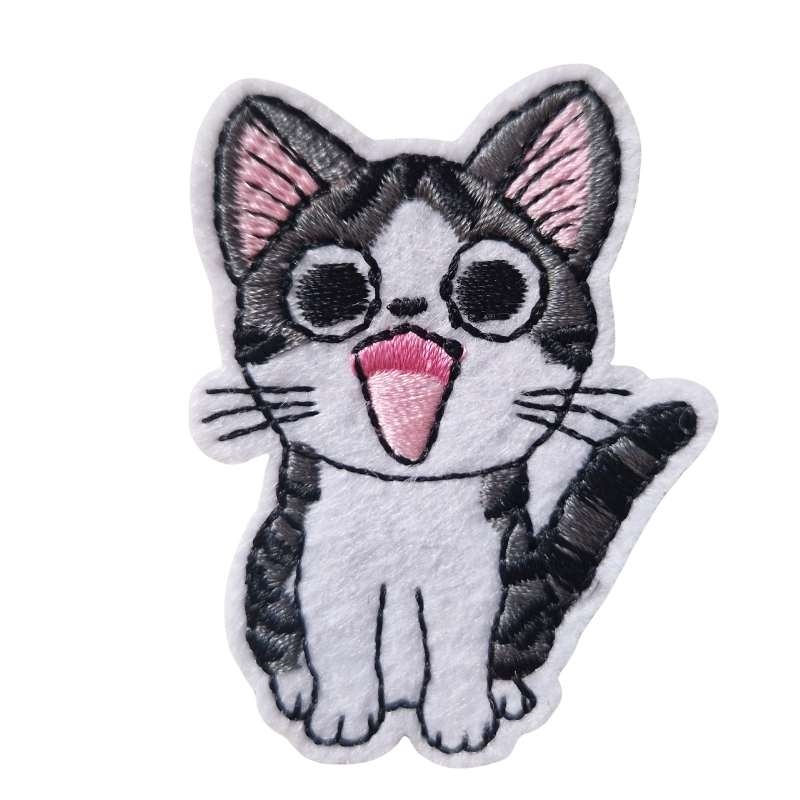 Strygemærke kattekilling i farverne grå og sort. Strygemærket er broderet på en hvid baggrund. Strygemærket måler cirka 4,5x6 cm. Lige til at stryge på tøjet.