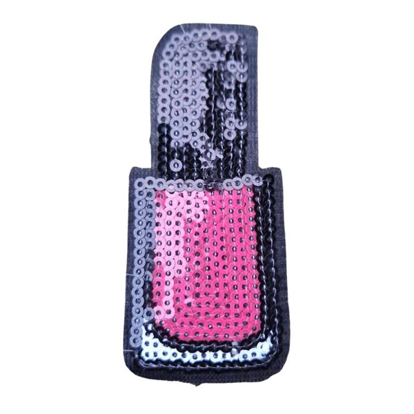 Strygemærke udformet som en neglak i pink og sort besat med pailetter. Strygemærket måler cirka 3,5x8 cm og er lige til at stryge på tøjet.