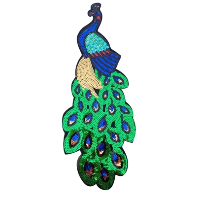 Strygemærke påfugl, grøn, blå og guld palietter 42,5x16 cm