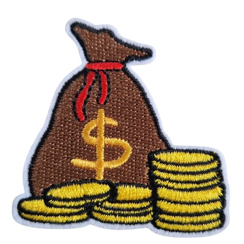 Strygemærke brun pengesæk med dollar tegn på og gule mønter. Strygemærket måler ca. 5x5 cm