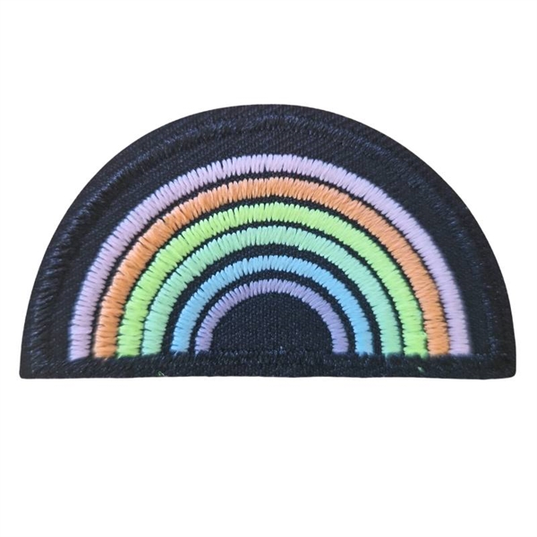 Strygemærke sort regnbue 5,5 x 3 cm, de farvede broderinger bliver selvlysende i mørke, når de har fået lys på sig forinden  Strygemærket er lige til at stryge på tøjet.