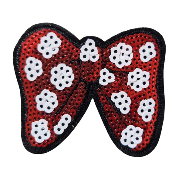 Strygemærke udformet som en fin palliet sløjfe i rød med hvide prikker a la Minnie Mouse. En fin sløjfe der virkelig kan give dit tøj et pift. Strygemærket måler cirka 6x7 cm og er lige til at stryge på tøjet.