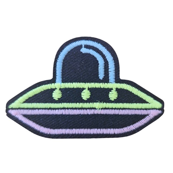Strygemærke UFO cm 5,5x3,5 cm.  Både den gule, lyseblå og den pink farve er selvlysende i mørke, når de har fået lys på sig forinden  Strygemærket er lige til at stryge på tøjet.