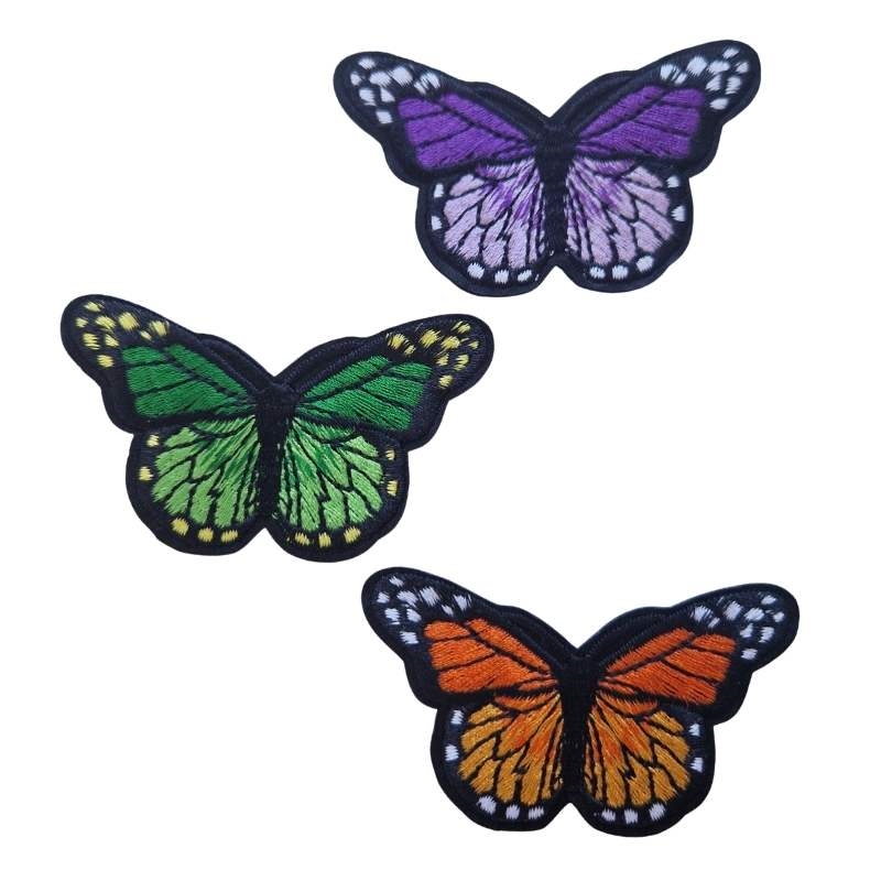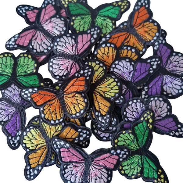 3 stk. smukke matchende sommerfugle assotrede farver i nuancerne gul, orange, lilla, lyserød og grøn. Sommerfuglene måler cirka 5x8 cm og er til at stryge på tøjet.