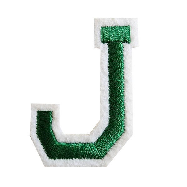 Strygemærke J er broderet på hvidt filt med grøn tråd. Mærket måler 4,9 cm i højden og 3,5 cm i bredden.