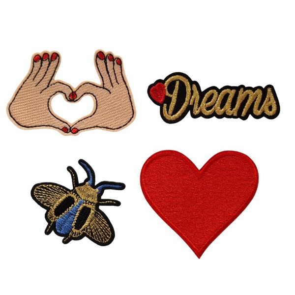 Et sæt med 4 strygemærker et rødt hjerte, et insekt i sort/blå/guld, tekst DREAMS sort/guld/rød og hænder der laver hjertetegn.