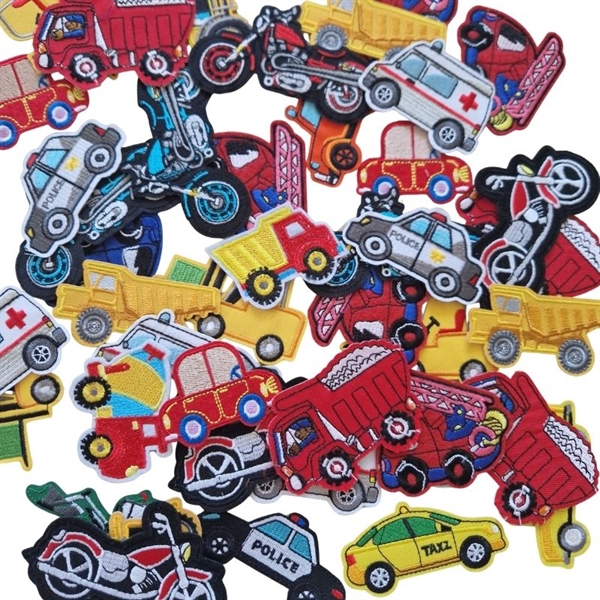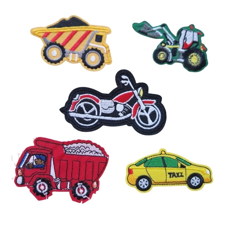 Strygemærker 5 stk. assorteret køretøjer måler ca. 6-8 cm i længden.