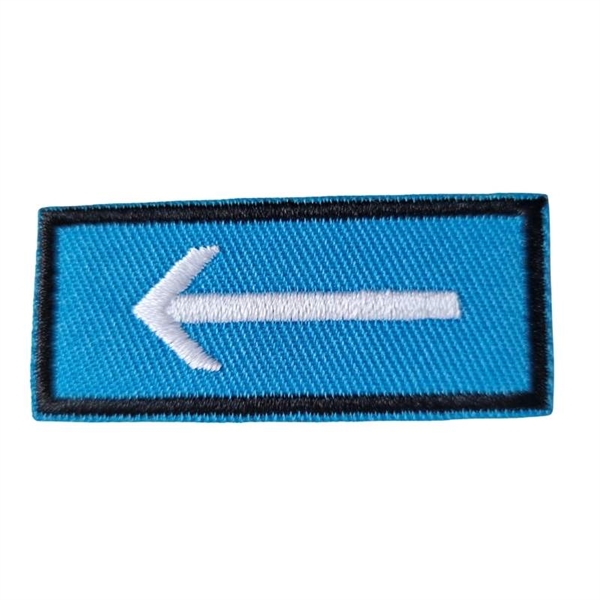 Strygemærke blå skilt med hvid pil. Strygemærketærket mål er cirka 5,5x2 cm. og er lige til at stryge på tøjet.