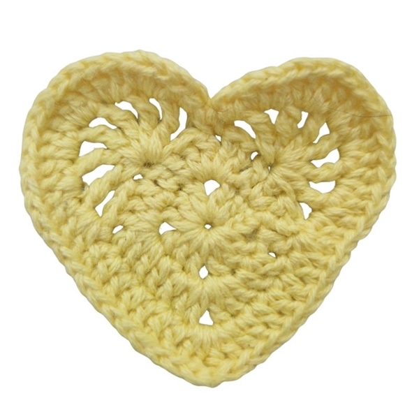 Strikket hjerte i gul måler cirka 5x4,5 cm og skal SYES på tøjet.