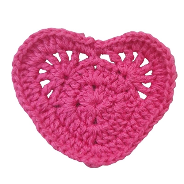 Strikket hjerte i pink måler cirka 5x4,5 cm og skl SYES på tøjet.