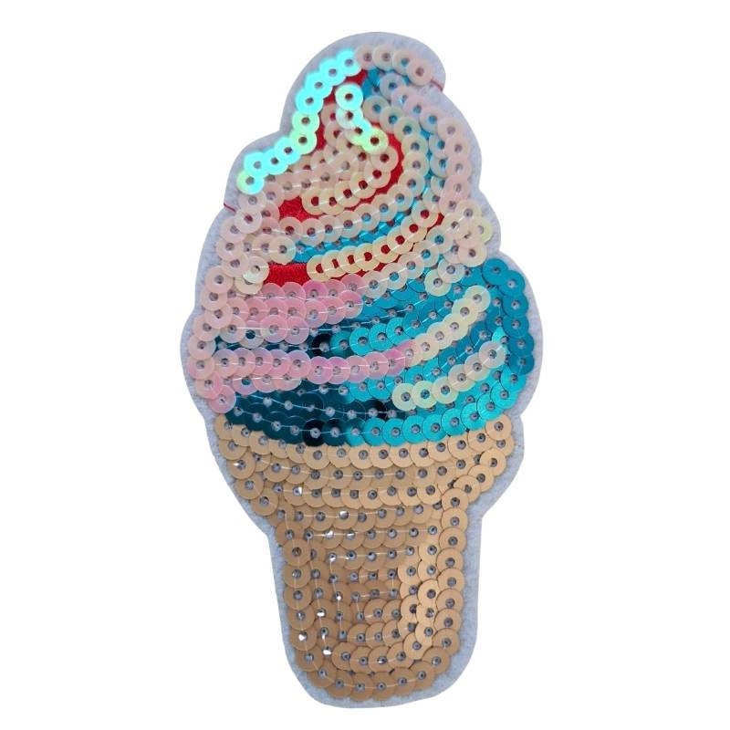 Den lækreste softice til at stryge på tøjet. Soficen måler cirka 6x11,5 cm og er besat med palietter i guld, petrolums blå og lyserød, der er røde broderinger på isens top.