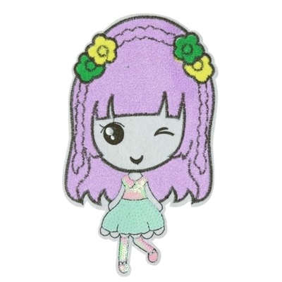 Symærke 14x25 cm pige med lilla frótte hår med gule og grønne blomster. Pigen har lyserøde ben belagt med palietter og kjole i lyseblå og lyserøde palietter.