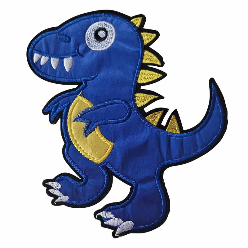 Den fineste blå drage i blåt blankt stof, med gul mave, gule takker og hvide klør. Strygemærket er syet på sort filt. Målene på dragen er 20x17 cm og symærket skal syes på stoffet.