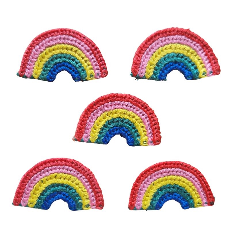 Her får du 5 smukke regnbuer i farverne rød, lyserød, gul, grøn og blå. regnbuerne 3,5x2,5 cm. REgnbuerne er meget oplagte at bruge til at give din strik nytliv. HUSK at regnbuerne skal syes på, det er hurtigt og nemt gjort.